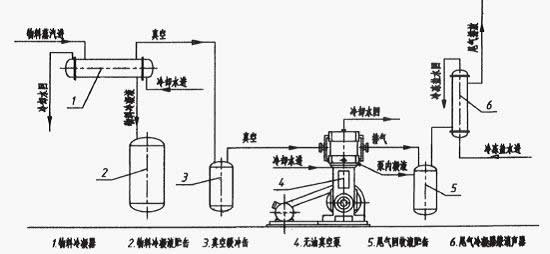由于無油真空泵沒有真空介質(真空泵油、水等),通過無油真空泵的氣體未受真空介質的污染。因而回收溶劑是潔凈的。這樣真空下冷凝部份轉換成常壓下冷凝,大大提高了溶劑類物料的回收率,對真空下難冷凝的物料特別有利。通過該流程配置,排放的尾氣中已基本不含有機廢氣。另外,泵排空氣體通過列管式冷凝器的殼程后,噪聲也大為下降。