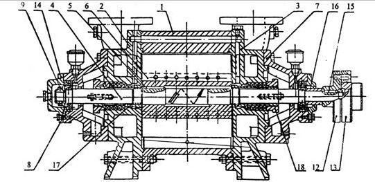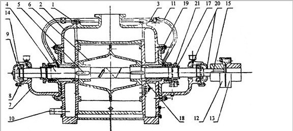 裝配時最主要的是調整葉輪端面和側蓋的間隙,在兩邊總的間隙對開SZ-3及SZ-4不得超過0.4毫米,對SZ-1及Z-2不得超過0.3毫米。間隙由泵體(1)和側蓋(2)之間加墊取得,葉輪兩端間隙應該均稀,可擰軸套螺母(17)以移動葉輪來保證.